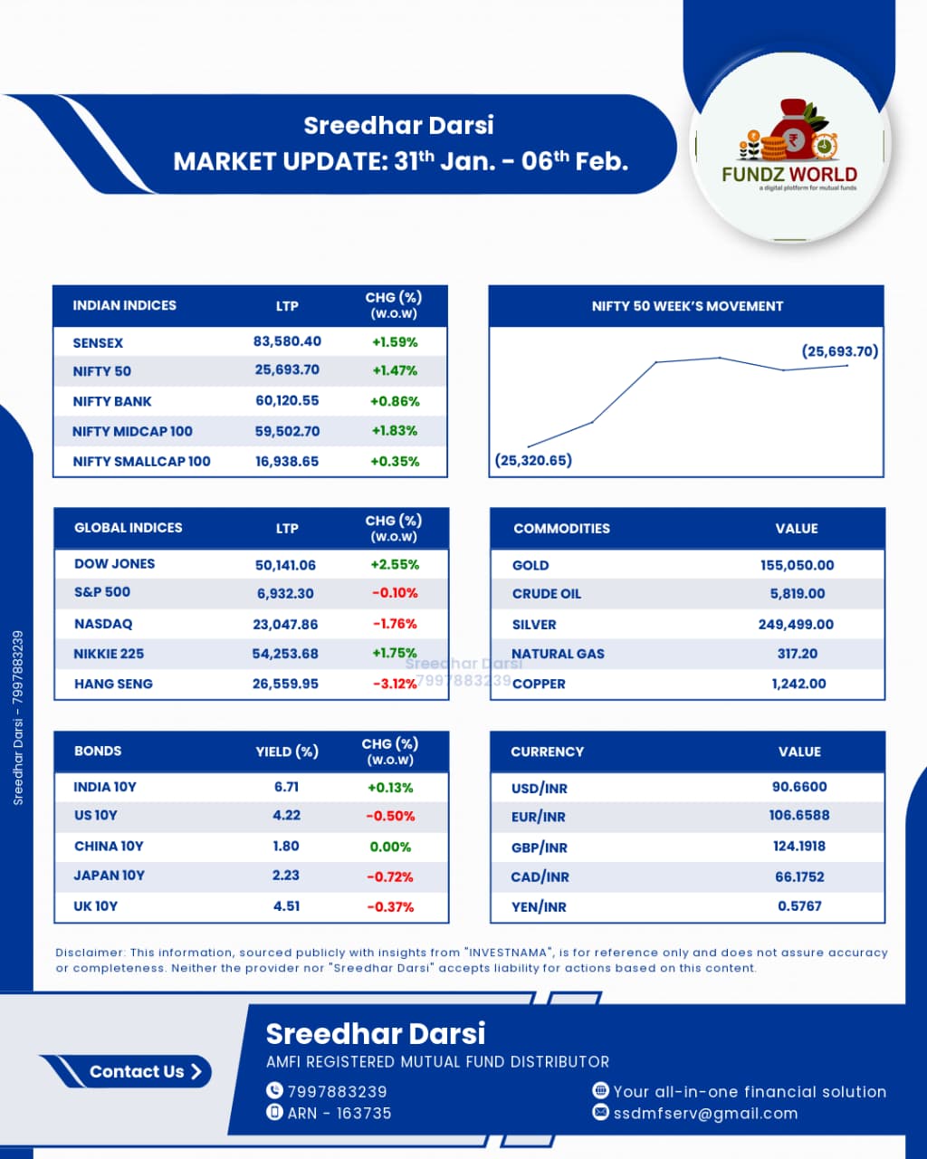 • ๐Ÿ‡ฎ๐Ÿ‡ณ Indian Market: Dalal Street ended the week on a positive note ๐Ÿ“ˆ as benchmark indices extended gains, supported by strong sector performance and better market breadth. The key highlight was the Indiaโ€“US trade deal ๐Ÿ‡ฎ๐Ÿ‡ณ๐Ÿ‡บ๐Ÿ‡ธ, which improved Indiaโ€™s external outlook. A sharp cut in US tariffs on Indian goods from 50% to 18% boosted sentiment and is expected to support exporters ๐Ÿšข going ahead.